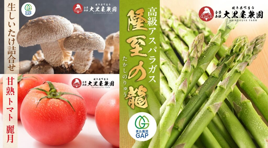 岐阜県下呂市の豊かな自然と最新技術で育てた大黒屋農園の自慢の味を、「ふるさと納税」の返礼品としてお届けしています。驚きの甘さと太さを誇る高級アスパラガス「隆至の龍」、樹上でじっくり完熟させた濃厚なトマト「麗月」、そして肉厚でジューシーな「菌床生椎茸」。私たちの情熱を込めた逸品を、ぜひご家庭でご堪能ください。